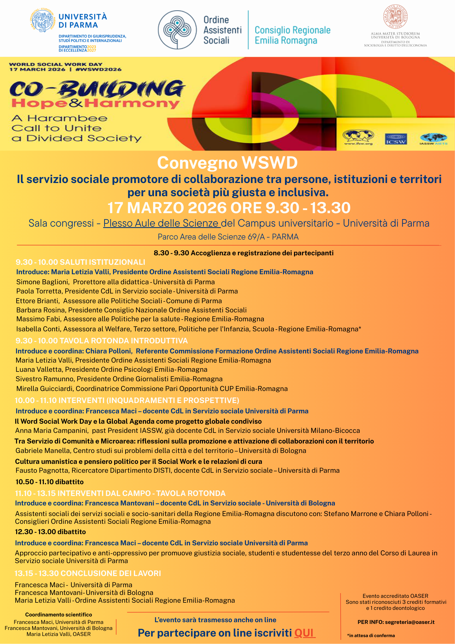 Il 17 marzo 2026 ci ritroviamo a Parma per CO-BUILDING Hope and Harmony: una mattinata dedicata al servizio sociale come collante tra istituzioni, territori e persone.